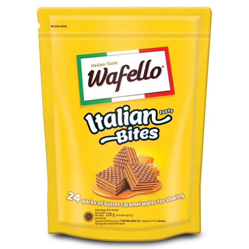 Roma Wafello Italian Bites Wafer Caramel 234 g adalah wafer keci isi krim karamel yang lumer dan berlimpah. Sangat cocok untuk disajikan dirumah pada saat acara kumpul keluarga. Dengan cita rasa khas Italia, wafer renyah berlapis krim karamel yang lezat ini cocok dijadikan camilan favorite anda dan keluarga. Tersedia dalam kemasan pouch 234 g.