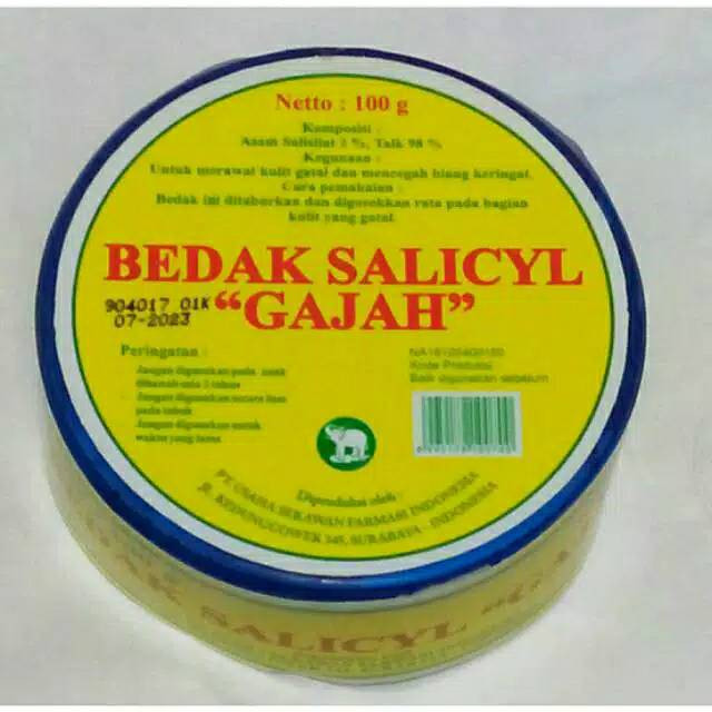 Bedak Salicyl Menthol Gadjah sangat manjur untuk menyembuhkan macam-macam penyakit kulit, seperti: gatal-gatal pada kulit, keringat buntet, bisul-bisul, cacar air, gabaken, dll penyakit kulit.