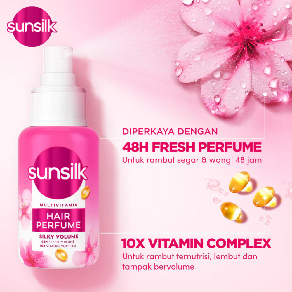 Sunsilk Multivitamin Hair Perfume. Produk 2-in-1 perfume yang mengandung multivitamin & perfume. Kini hadir dengan varian SILKY VOLUME untuk rambut tampak bervolume. Memiliki teknologi anti bau (malodor technology) yang memberikan wangi bunga segar yang tahan 48 jam dilengkapi dengan 10x vitamin complex. Mengandung NIACINAMIDE dan VITAMIN E yang dapat menutrisi rambut kamu menjadi tampak bervolume!