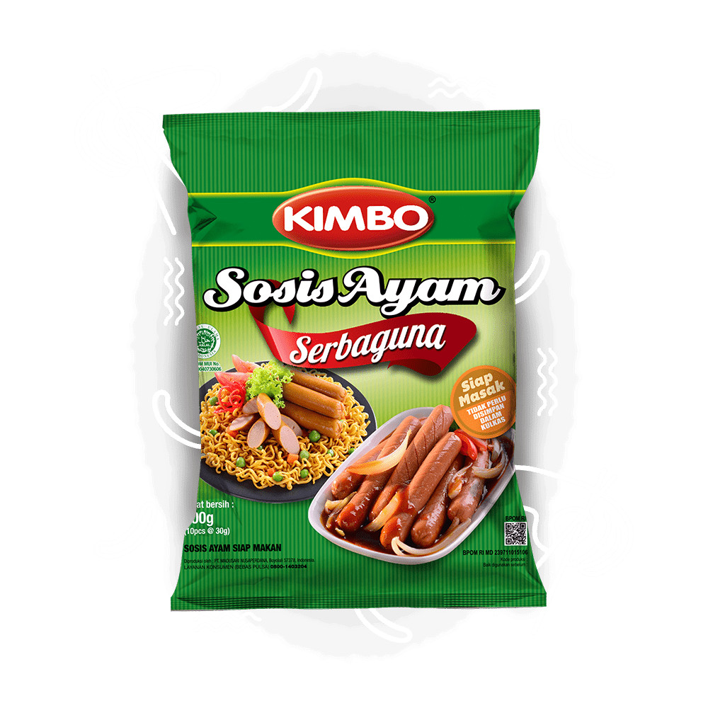 KIMBO Sosis Ayam Serbaguna merupakan sosis yang dibuat dari daging ayam yang aman, bergizi, dengan citarasa yang istimewa. Lebih terasa daging dan bumbunya, sehingga enak dinikmati semua kalangan. Cocok untuk masakan apapun baik makanan yang berkuah maupun goreng. Enak dimakan sebagai lauk nasi/mie ataupun sebagai camilan yang dicocol dengan mayonaise/saus sambal. Sosis ini cocok sebagai pilihan alternatif selain daging sapi. Jenis sosis ini selongsong harus dikupas terlebih dahulu.
