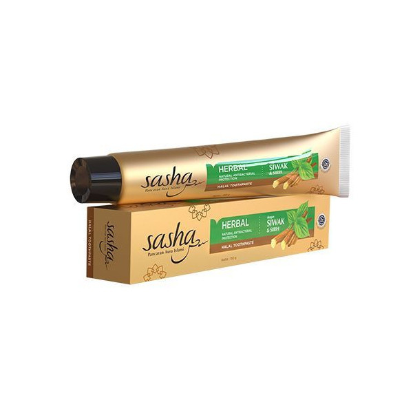 Sasha Halal Toothpaste Herbal mengandung ekstrak siwak dan daun sirih. Ini merupakan pasta gigi herbal dengan serpihan asli siwak yang diperkaya ekstrak daun sirih. Pasta gigi ini mampu melawan bakteri penyebab plak gigi dan bau mulut. Dilengkapi dengan calcium dan fluoride untuk menjaga kesehatan dan kekuatan gigi. Nafas jadi lebih segar dan tahan lama.